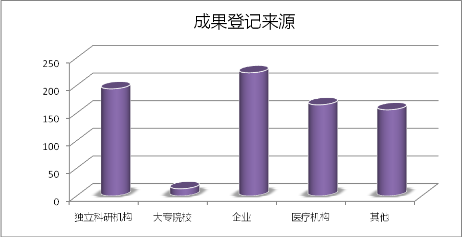 成果登記來源有獨立科研機構(gòu)、大專院校、企業(yè)、醫(yī)療機構(gòu)和其他行業(yè),其中,獨立科研機構(gòu)194項,占總量的25.8%;大專院校13項,占總量的1.7%;企業(yè)223項,占總量的29.7%;醫(yī)療機構(gòu)165項,占總量的22.0%;其他156項,占總量的20.8%。