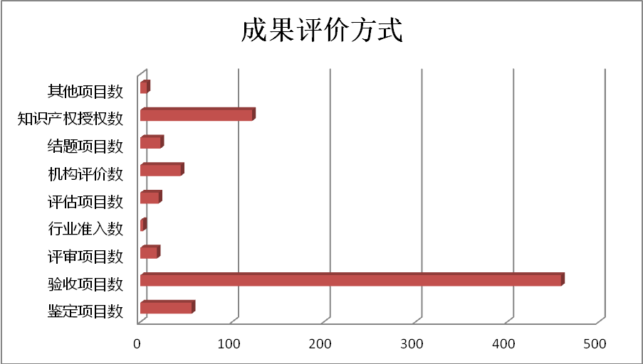 成果評價方式有鑒定、驗收、評審、行業(yè)準入、評估、機構(gòu)評價、結(jié)題、知識產(chǎn)權(quán)授權(quán)和其他,其中,驗收項目459項,占總量的61.1%;知識產(chǎn)權(quán)授權(quán)項目122項,占總量的16.2%;鑒定項目56項,占總量的7.5%;機構(gòu)評價項目為44項,占總量的5.9%;評審項目18項;行業(yè)準入項目為3項;評估項目為20項;結(jié)題項目22項;其他項目7項。
