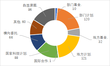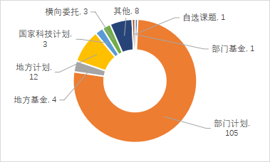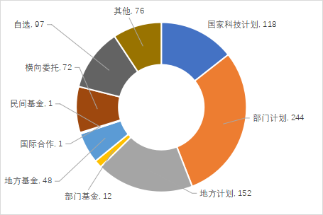 科技成果以財政支持的課題來源為主。來自國家科技計劃,部門計劃,地方計劃及部門基金和地方基金等財政支持的科技成果574項,占登記成果總量的69.91%。其中,部門計劃、地方計劃和國家科技計劃登記科技成果數(shù)量遠高于其他課題來源,分別占登記科技成果總量的29.72%、18.51%和14.37%。