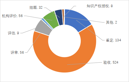 2022年度登記的非涉密成果中,驗收項目524項,占比63.82%;鑒定項目134項,占比16.32%;評審項目56項,占比6.82%;機構評價56項,占比6.82%;結題項目32項,占比3.90%;評估項目9項,占比1.10%;知識產權授權8項,占比0.97%;未登記行業(yè)準入。