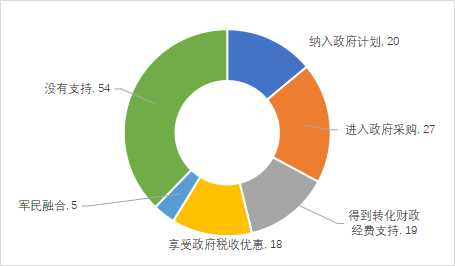 從應用技術成果獲得政府支持的情況統(tǒng)計,共有143項成果反饋有效數(shù)據(jù)。其中,有89項成果獲得了政府支持,支持形式主要為進入政府采購,占比為18.88%;其次為納入政府計劃和得到轉化財政經(jīng)費支持,占比分別為13.99%和13.29%;享受政府優(yōu)惠的項目占比為12.59%。37.76%的應用技術成果反饋在轉化階段沒有得到政府支持。