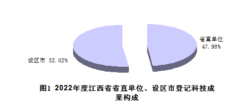 2022年由于加強宣傳,江西省科技成果登記在總量上較去年有所上升,全年共登記1705項,與去年的1218項相比上升了487項,上升39.98%。其中,省直單位的成果登記有818項,占47.98%,比上年度的591項上升了38.41%;設(shè)區(qū)市的成果登記有887項,占成果登記總數(shù)的52.02%,比上年的627項上升了41.47%。全省11個設(shè)區(qū)市成果登記最多的有145項,最少的為12項,全省各設(shè)市區(qū)之間仍有差距。其中南昌市為145項,贛州市為116項,分別占總數(shù)的8.50%和6.80%,占設(shè)區(qū)市總數(shù)的16.35%和13.08%;宜春市為109項,新余市為97項,分別占總數(shù)的6.39%和5.69%,占設(shè)區(qū)市總數(shù)的12.29%和10.94%。(見圖1、表1)。表1中設(shè)區(qū)市的基礎(chǔ)理論成果32項,軟科學成果0項,較去年有明顯上升。