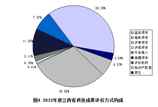 2022年度江西省登記的成果評價方式以驗收為主,機構(gòu)評價、結(jié)題為輔,鑒定及其他評價方式并存。登記成果中驗收項目522項,占登記成果總數(shù)的30.62%,比上年上升14.47個百分點;機構(gòu)評價項目129項,占7.57%,結(jié)題項目188項,占11.03%;知識產(chǎn)權(quán)授權(quán)項目653項,占38.30%;鑒定、評審、評估、行業(yè)準入等其他評價方式項目168項,占9.85%(見圖4)。