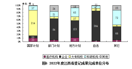 在成果登記數(shù)據(jù)中,各級各類科技計劃項目成果完成單位分布主要集中在企業(yè)、大專院校。企業(yè)所占比例最高,占44.33%,其次大專院校占26.24%,再次醫(yī)療機構(gòu)占13.38%,獨立科研機構(gòu)占11.08%,其他占4.97%。其中,國家科技計劃項目成果中大專院校所占比例最高,占65.92%;地方計劃項目中企業(yè)比例最高,占48.70%;在自選項目中,企業(yè)也是占比例最大,占82.87%,(見圖6)。