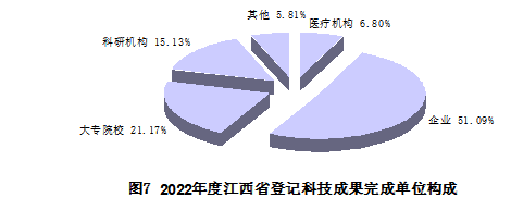 2022年度全省登記的科技成果中,按第一完成單位屬性分,企業(yè)登記數(shù)所占比例最大,共871項,占51.09%;其次是大專院校361項,占21.17%,獨立科研機構(gòu)258項,占15.13%,醫(yī)療機構(gòu)116項,占6.80%,其他單位99項,占5.81%。數(shù)據(jù)顯示,2022年我省科技成果主要分布在企業(yè)、大專院校,在成果第一完成單位中所占比例為本年度登記成果完成單位的72.26%,凸顯了企業(yè)與大專院校在我省科技創(chuàng)新中的主體地位(見圖7)。