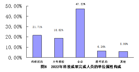 2022年度登記的科技成果涉及到的完成人員共12078人次。以單位屬性看,企業(yè)和獨立科研機構(gòu)的科技人員最多。其中,企業(yè)科技人員5704人次,占47.23%;科研機構(gòu)科技人員2622人,占21.71%;大專院??萍既藛T2273人,占18.82%;醫(yī)療機構(gòu)科技人員756人,占6.26%;其他723人,占5.99%(見圖8)。