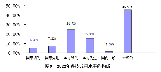 在2022年全省登記的1440項應(yīng)用技術(shù)成果中,達到國際領(lǐng)先水平項目77項,占應(yīng)用技術(shù)成果總數(shù)的5.35%;達到國際先進水平的104項,占7.22%;達到國內(nèi)領(lǐng)先和國內(nèi)先進水平的成果總數(shù)為577項,占40.07%;國內(nèi)一般水平的成果20項,占1.39%。未評價成果662項,占45.97%。國內(nèi)先進水平以上的項目占應(yīng)用技術(shù)成果總數(shù)的52%以上。(見圖9)。