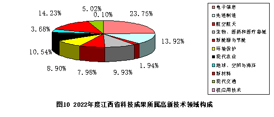 2022年度江西省登記的1440項應(yīng)用技術(shù)成果中,有977項屬高新技術(shù)領(lǐng)域,占登記的科技成果總數(shù)的57.30%。其中,電子信息232項,占所登記的高新技術(shù)領(lǐng)域成果總量的23.75%;先進制造136項,占13.92%;航空航天19項,占1.94%;現(xiàn)代交通49項,占5.02%;生物醫(yī)藥和醫(yī)療器械97項,占9.93%;新材料139項,占14.23%;新能源與節(jié)能78項,占7.98%;環(huán)境保護87項,占8.90%;地球、空間與海洋36項,占3.68%;核應(yīng)用技術(shù)1項,占0.10%;現(xiàn)代農(nóng)業(yè)103項,占10.54%。電子信息領(lǐng)域在全省高新技術(shù)領(lǐng)域中所占比例最高,其次新材料和先進制造也都占有較大比例( 見圖10)。