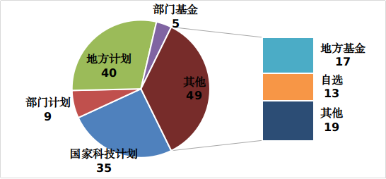 登記的138項(xiàng)科技成果中,以各級(jí)政府計(jì)劃和基金項(xiàng)目產(chǎn)生的成果為主,合計(jì)106項(xiàng),占登記成果總數(shù)的76.8%。其中,國(guó)家科技計(jì)劃35項(xiàng)、部門計(jì)劃9項(xiàng)、地方計(jì)劃40項(xiàng)、部門基金5項(xiàng)、地方基金17項(xiàng),地方計(jì)劃、地方基金項(xiàng)目分別較上年增長(zhǎng)5.3%、1.4倍。自選項(xiàng)目13項(xiàng)、其他項(xiàng)目19項(xiàng)。(見圖3)
