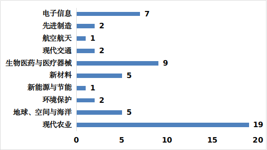 登記的83項(xiàng)應(yīng)用技術(shù)成果中,屬于高新技術(shù)領(lǐng)域的53項(xiàng),占應(yīng)用技術(shù)成果的63.9%。其中,電子信息7項(xiàng),先進(jìn)制造2項(xiàng),航空航天1項(xiàng),現(xiàn)代交通2項(xiàng),生物醫(yī)藥與醫(yī)療器械9項(xiàng),新材料5項(xiàng),新能源與節(jié)能1項(xiàng),環(huán)境保護(hù)2項(xiàng),地球、空間與海洋5項(xiàng),現(xiàn)代農(nóng)業(yè)19項(xiàng)。(見圖11)