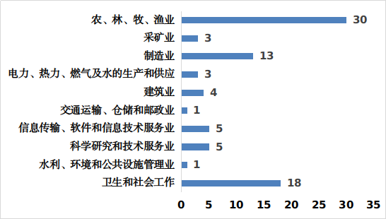按技術(shù)成果實(shí)際推廣應(yīng)用的行業(yè)分類進(jìn)行統(tǒng)計(jì),農(nóng)、林、牧、漁業(yè)30項(xiàng),采礦業(yè)3項(xiàng),制造業(yè)13項(xiàng),電力、熱力、燃?xì)饧八纳a(chǎn)和供應(yīng)3項(xiàng),建筑業(yè)4項(xiàng),交通運(yùn)輸、倉(cāng)儲(chǔ)和郵政業(yè)1項(xiàng),信息傳輸、軟件和信息技術(shù)服務(wù)業(yè)5項(xiàng),科學(xué)研究和技術(shù)服務(wù)業(yè)5項(xiàng),水利、環(huán)境和公共設(shè)施管理業(yè)1項(xiàng),衛(wèi)生和社會(huì)工作18項(xiàng)。(見圖12)