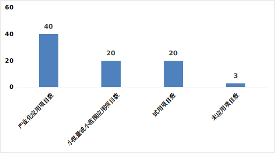 在所登記的83項(xiàng)應(yīng)用技術(shù)成果中,產(chǎn)業(yè)化應(yīng)用項(xiàng)目數(shù)40項(xiàng),占應(yīng)用技術(shù)成果的48.2%;小批量或小范圍應(yīng)用項(xiàng)目數(shù)20項(xiàng),占應(yīng)用技術(shù)成果的24.1%;試用項(xiàng)目數(shù)20項(xiàng),占所登記應(yīng)用技術(shù)成果的24.1%;未應(yīng)用項(xiàng)目數(shù)3項(xiàng),占應(yīng)用技術(shù)成果的3.6%。(見圖13)