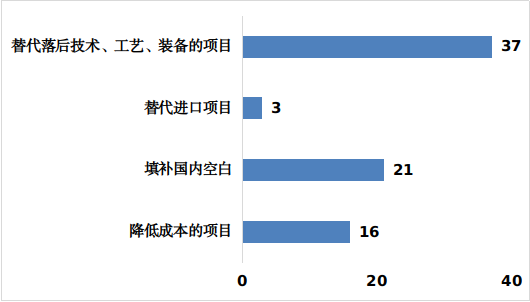 在所登記的83項(xiàng)應(yīng)用技術(shù)成果中,替代落后技術(shù)、工藝、裝備的項(xiàng)目37項(xiàng),替代進(jìn)口項(xiàng)目3項(xiàng),填補(bǔ)國(guó)內(nèi)空白21項(xiàng),降低成本的項(xiàng)目16項(xiàng)。(見圖14)